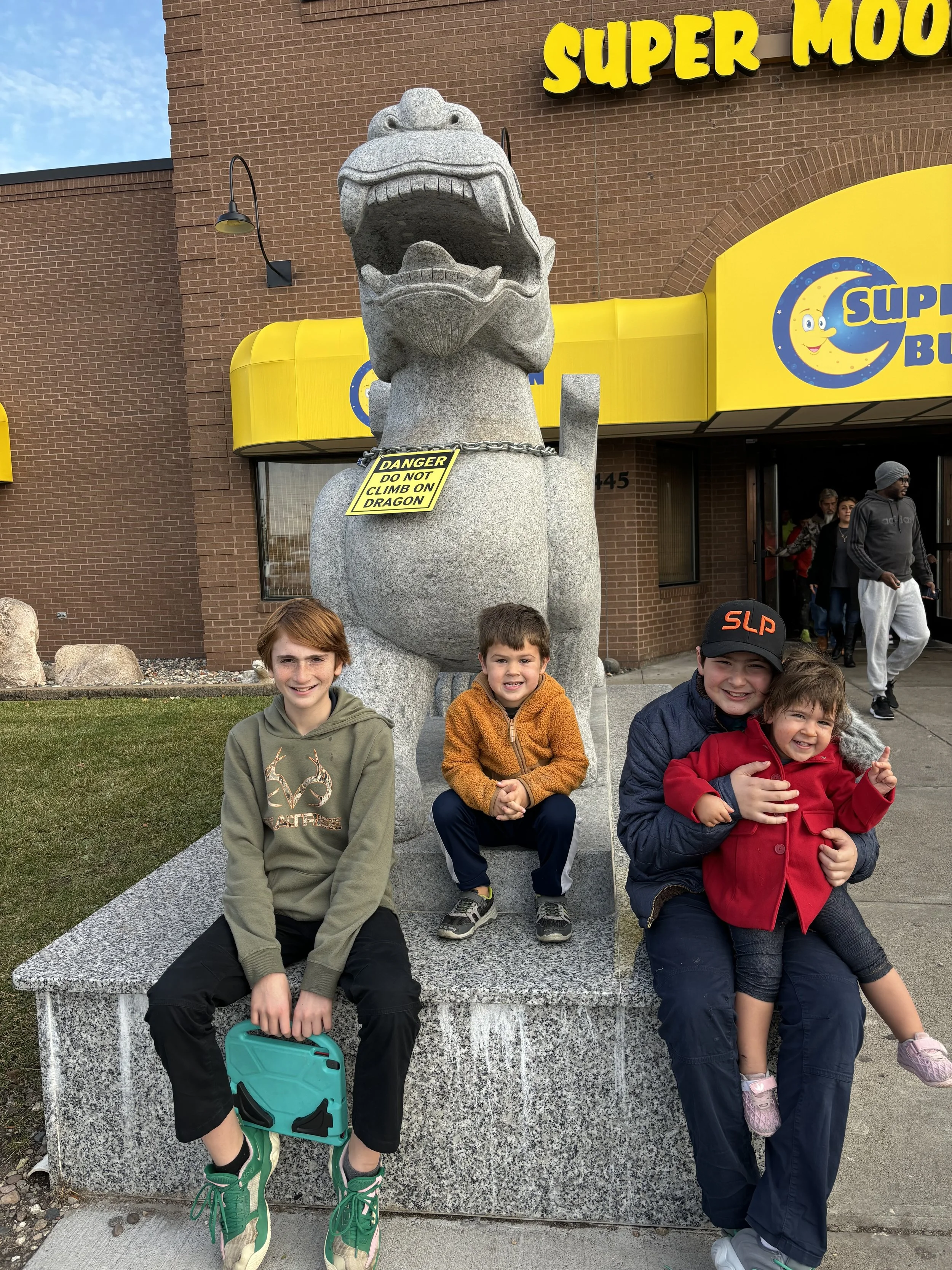 Four happy (and very full) kiddos after conquering the buffet—because family adventures are always better with egg rolls!